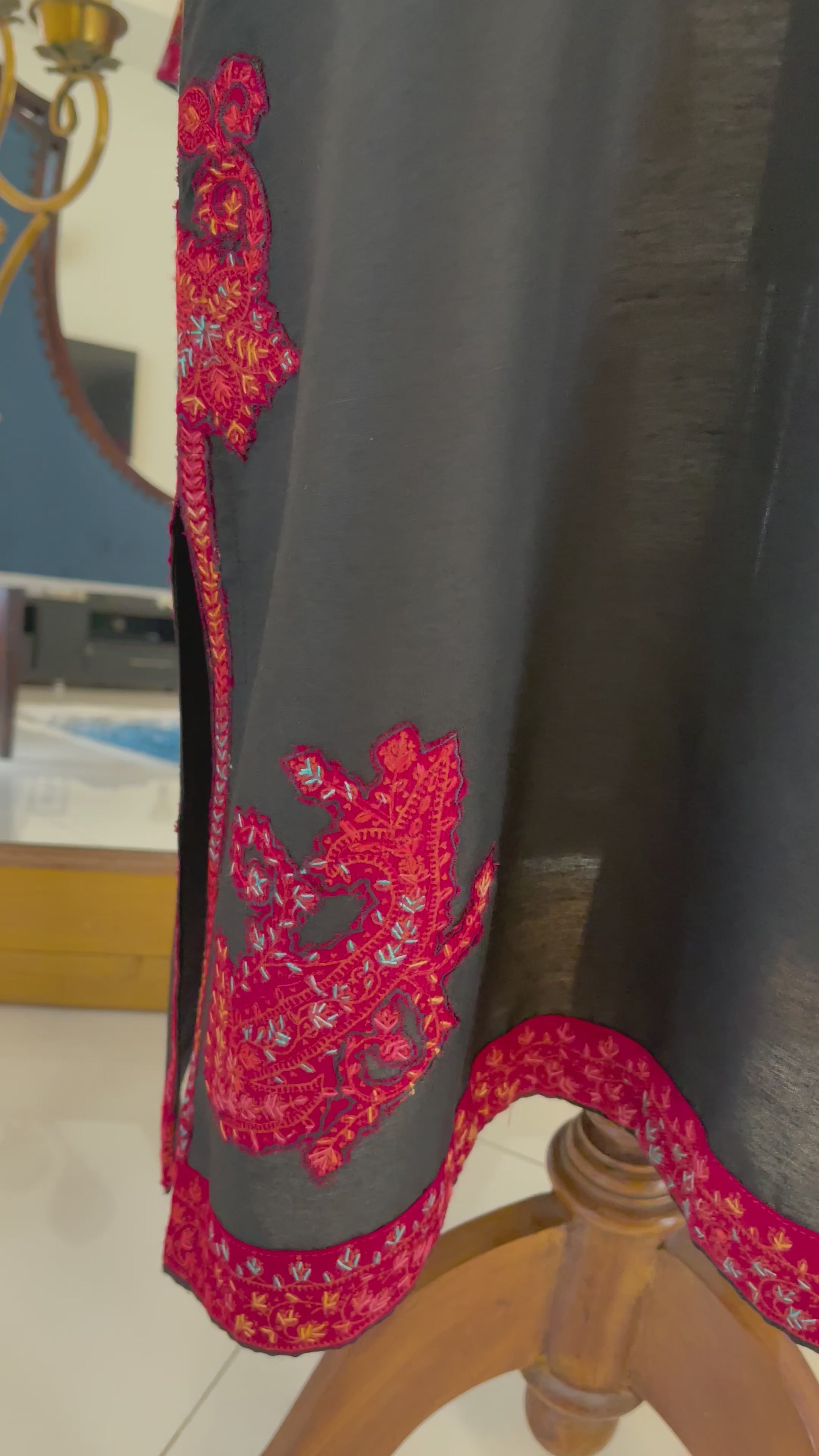 Black cotton Katan dress with red Kashmiri thread embroidery motifs