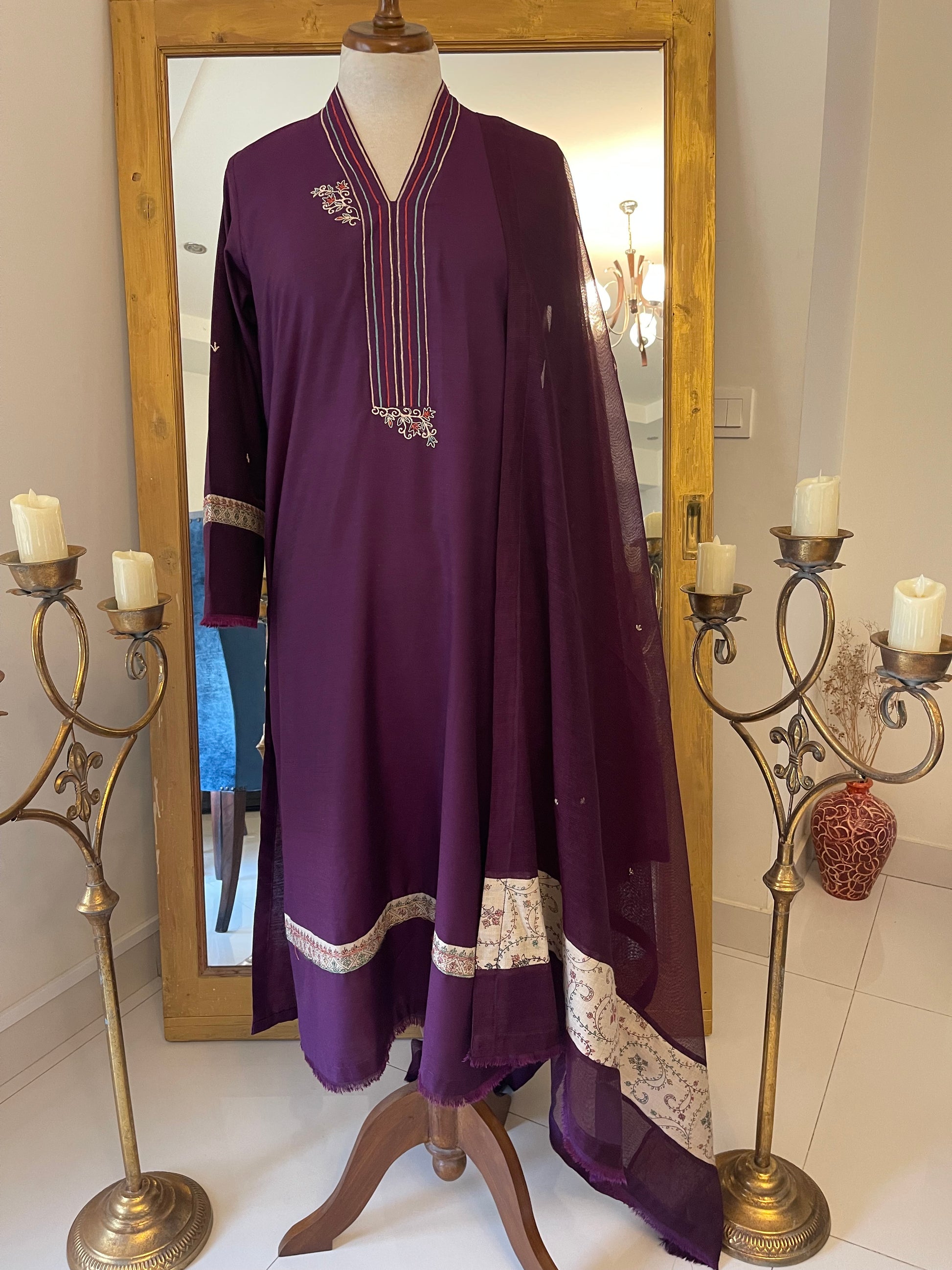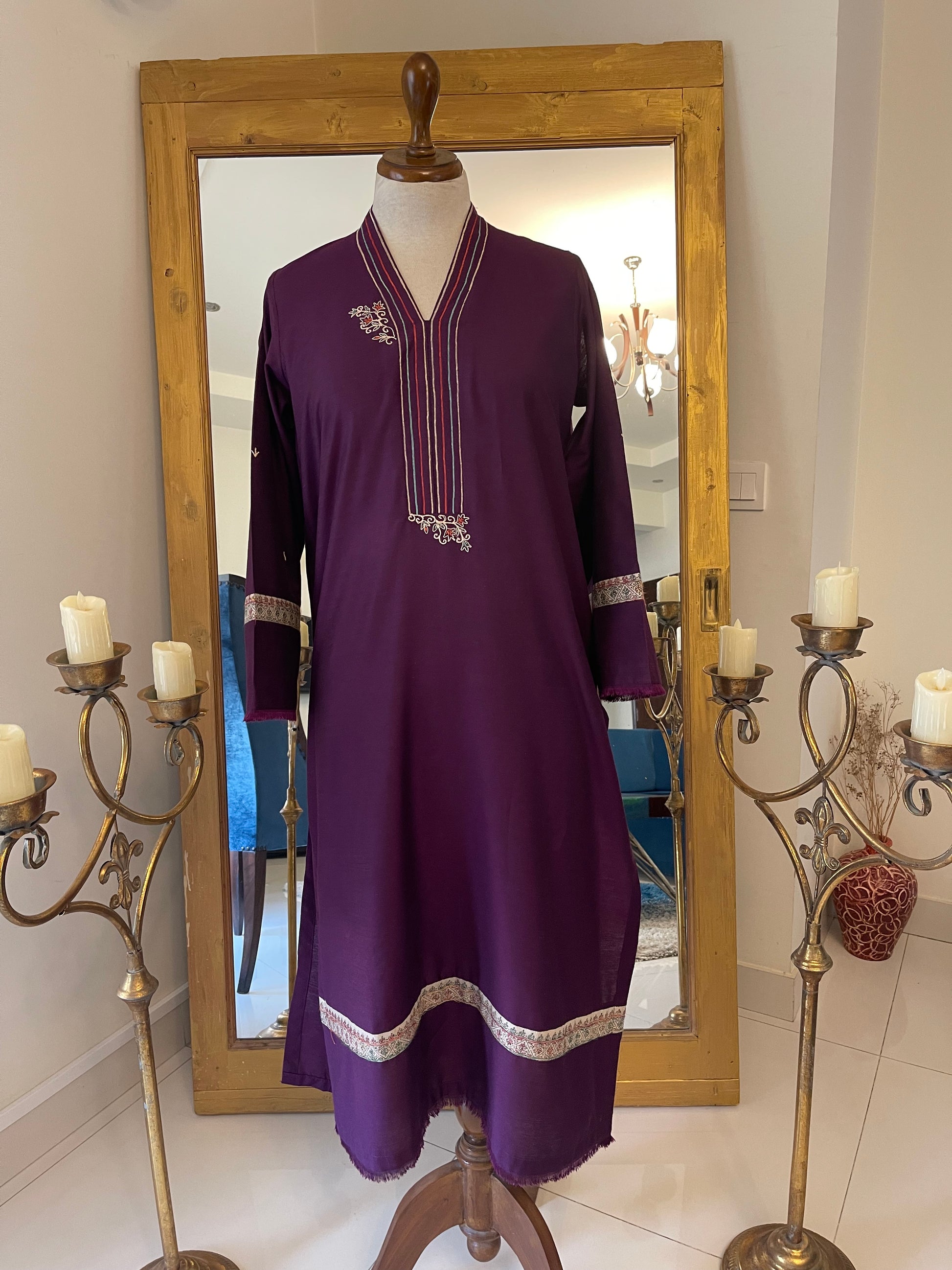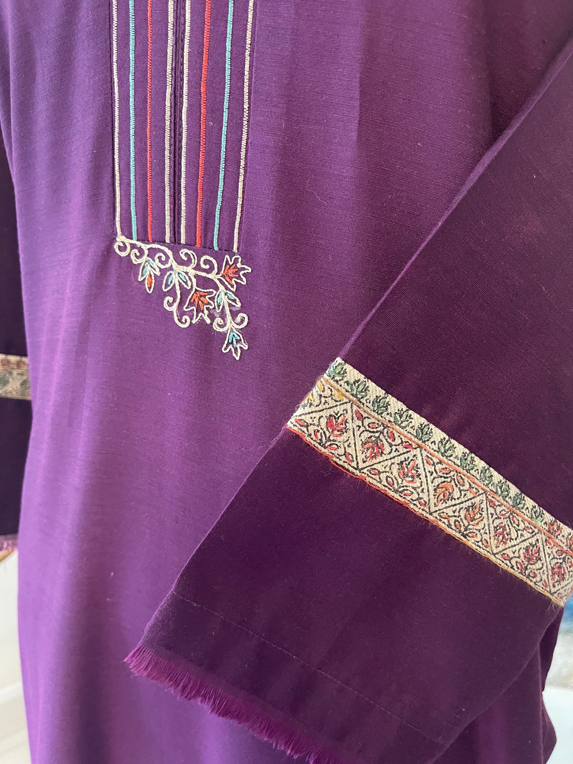 Dark Purple Cotton shirt and pants with Kashmiri pashmina borders and thread embroidery