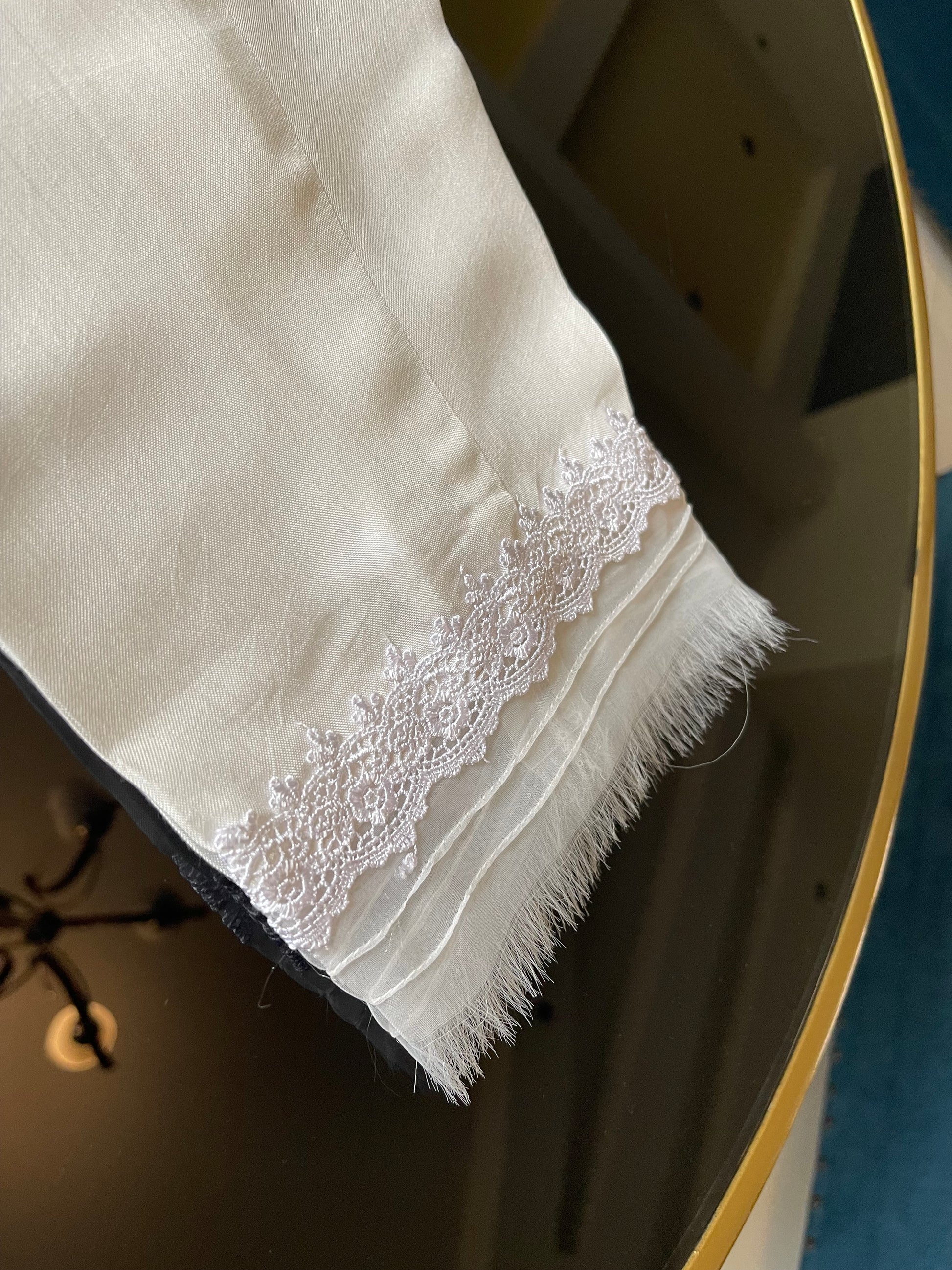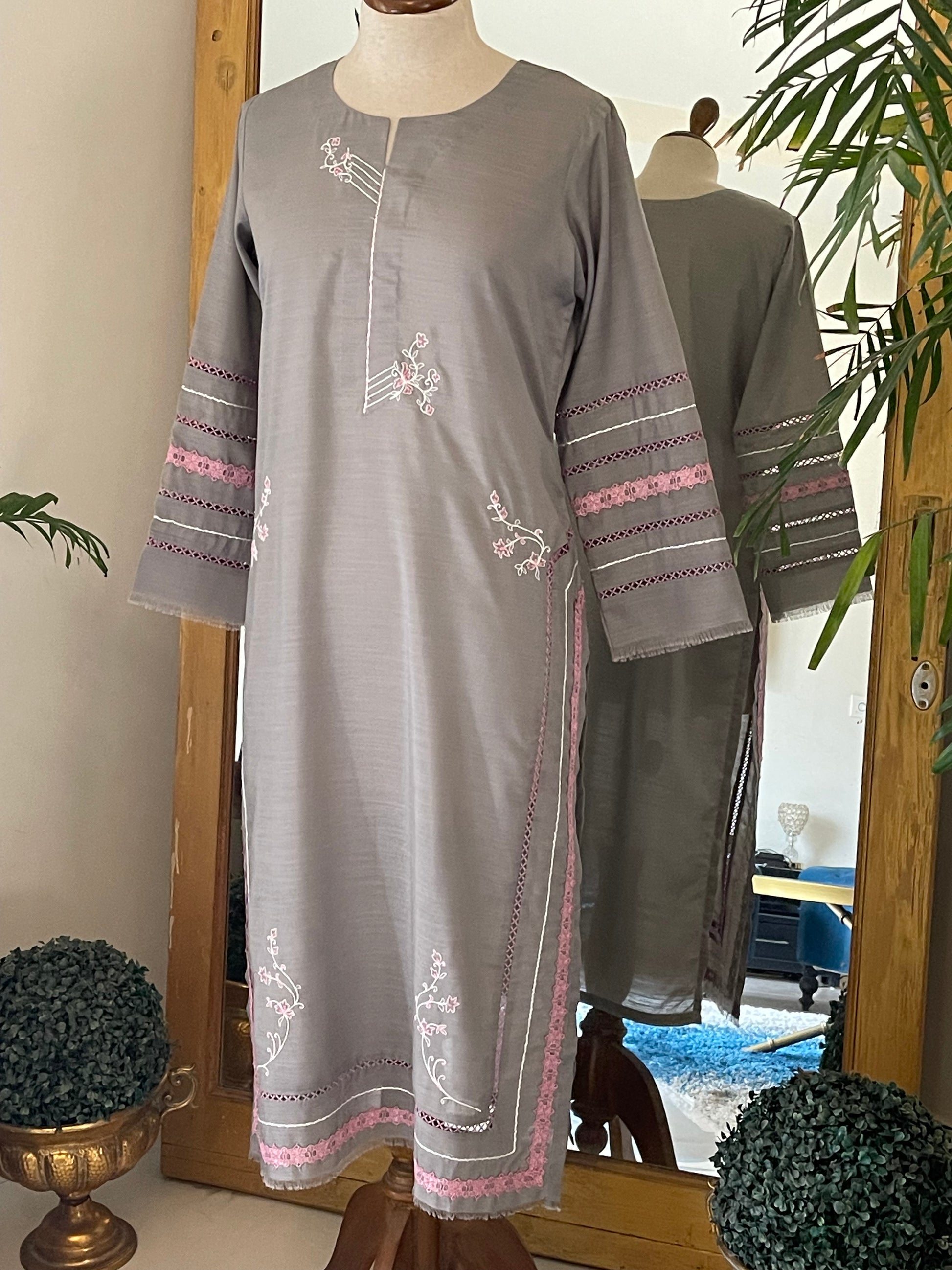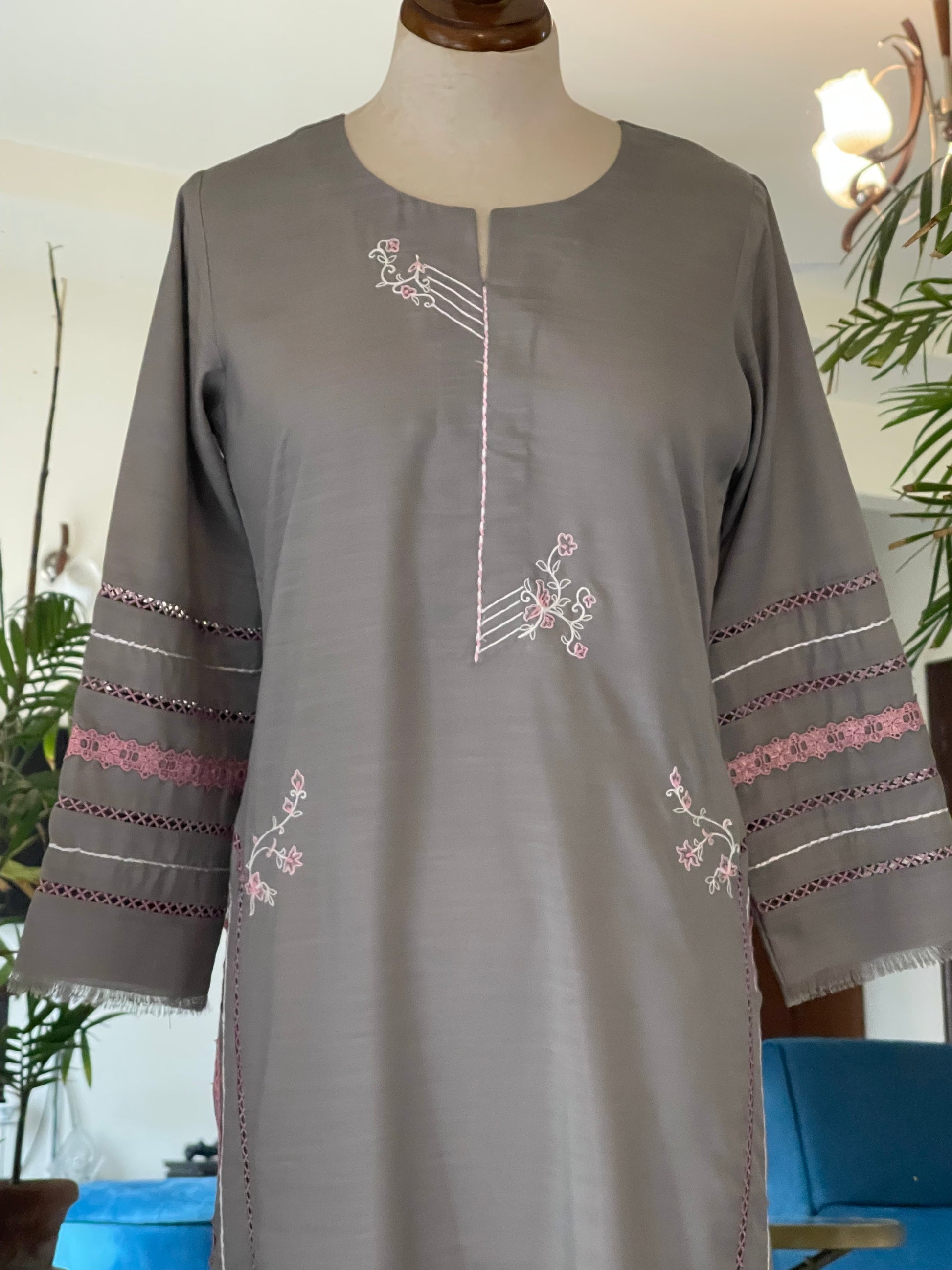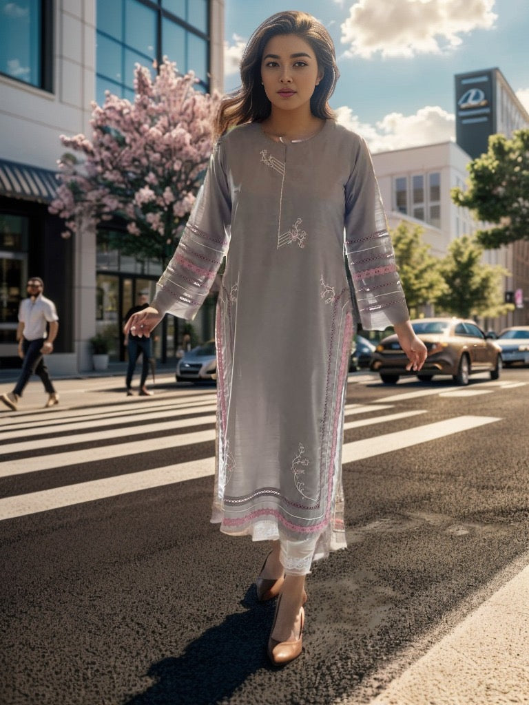 "Embrace the spirit of Ramazan in style with grey blended silk with Delicate thread embroidery and lace borders all around infuse a spring-summer vibe into every moment. A perfect blend of elegance and comfort for the sacred month.