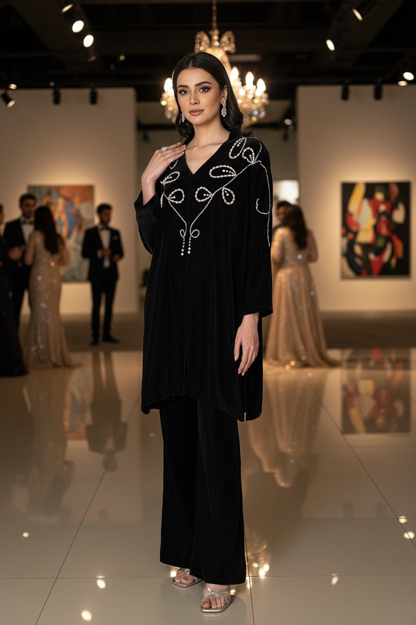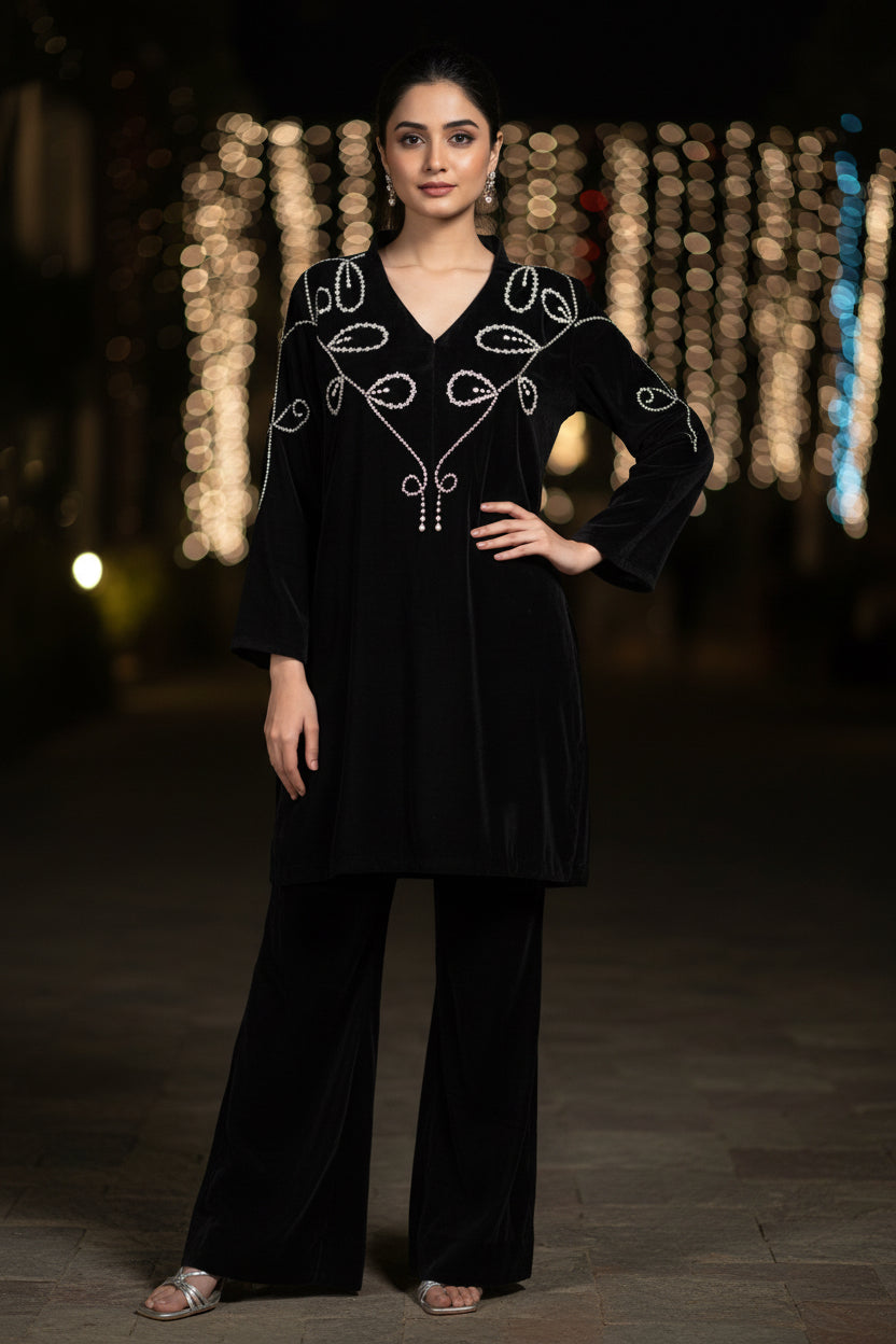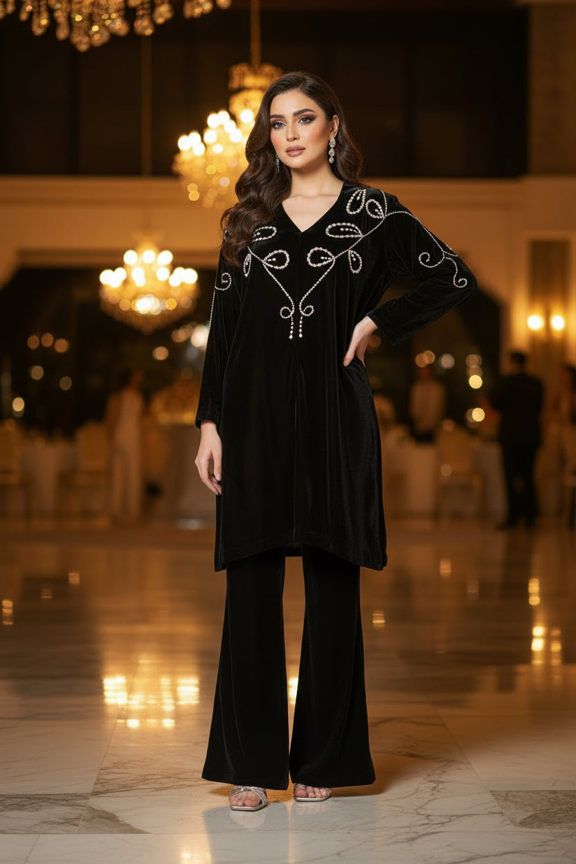 - Work: Hand-embellished diamanté detailing on neckline and sleeves