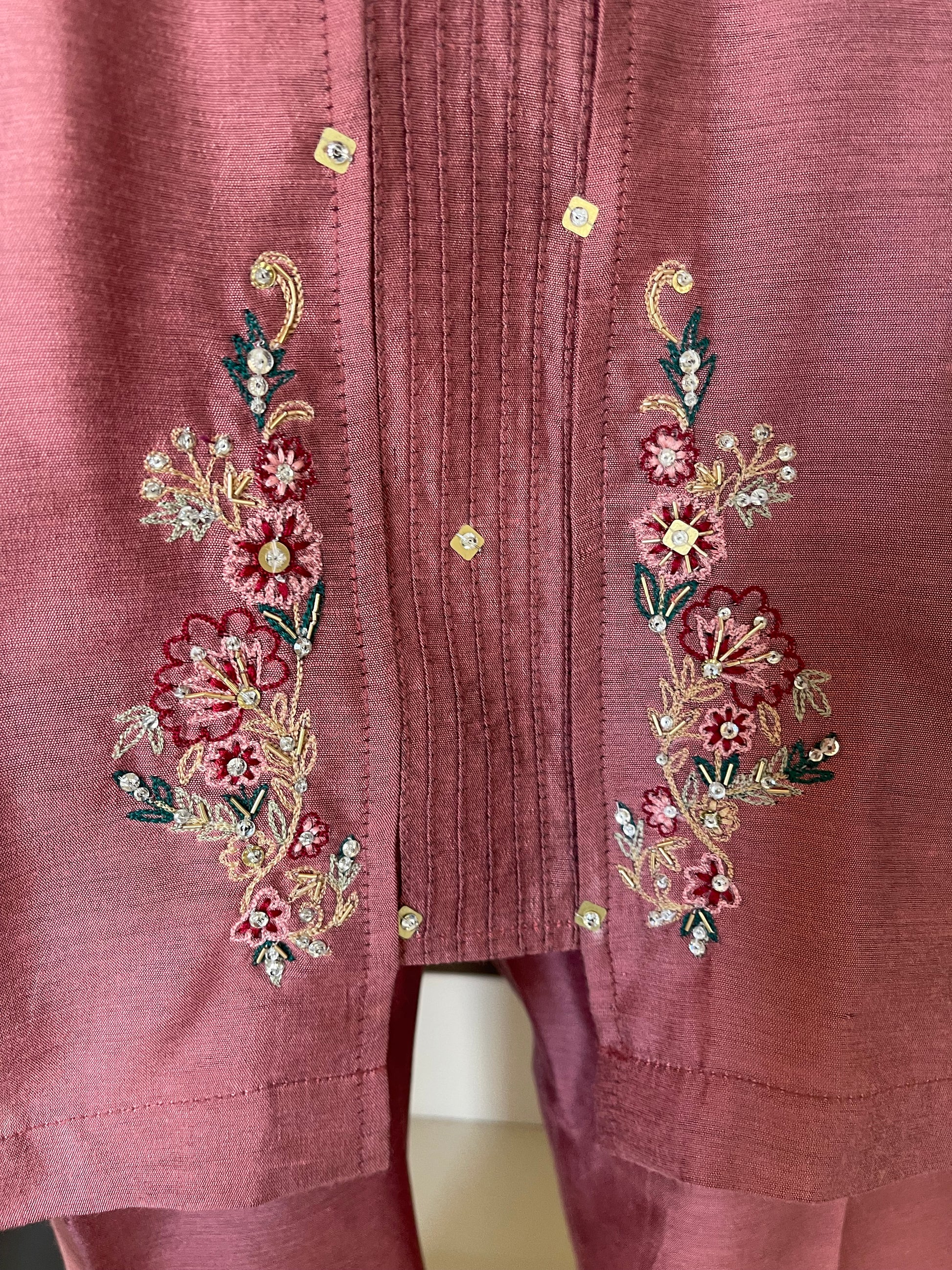 Dusky pink cotton katan outfit featuring delicate thread embroidery with subtle handwork. Paired with matching bell-bottom trousers.