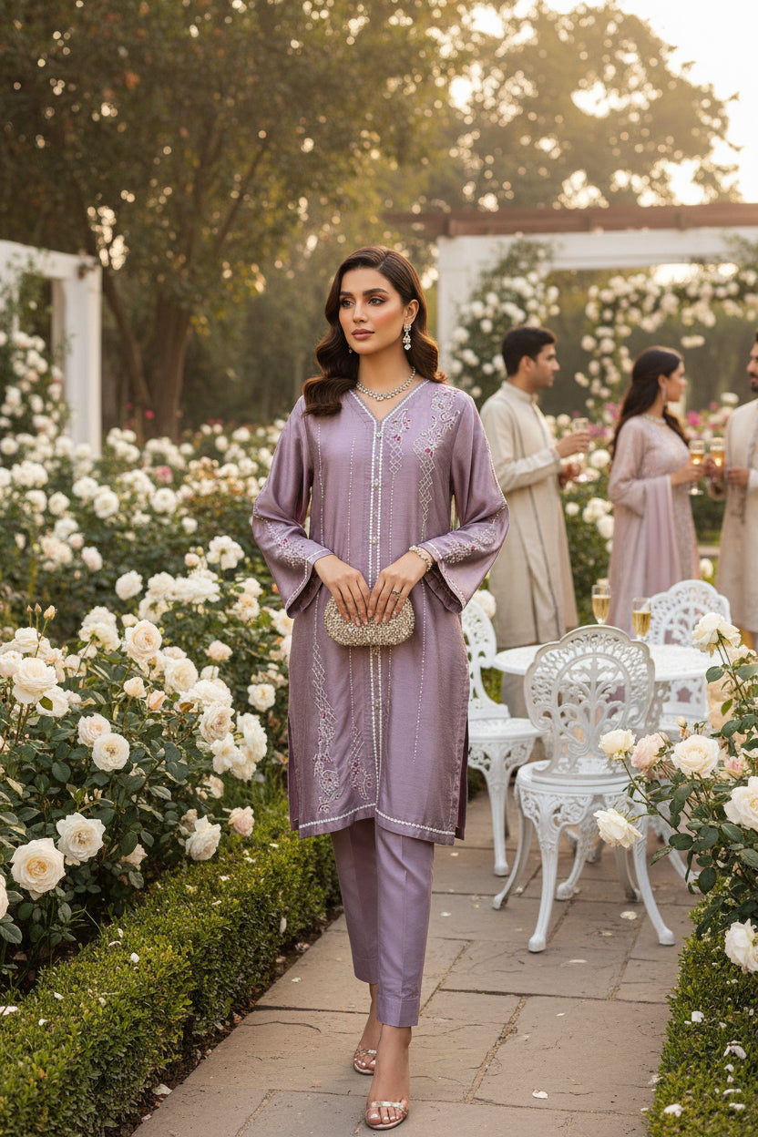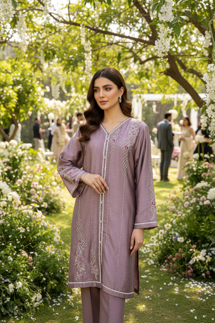 Elegant cotton shirt in a soft Dusty lilac tone, beautifully adorned with thread embroidery and delicate handwork.