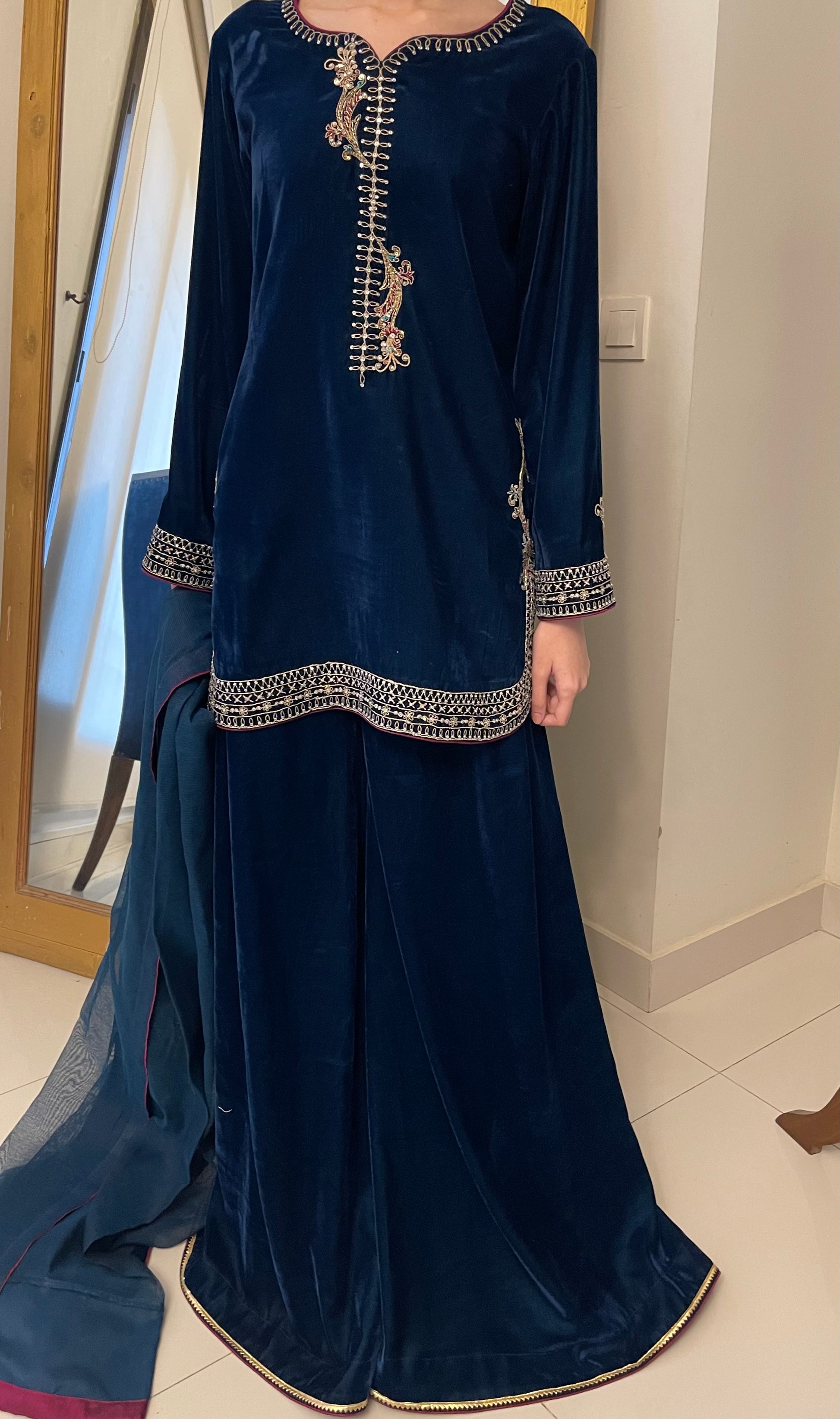 Teal blue short shirt with flaired pants
