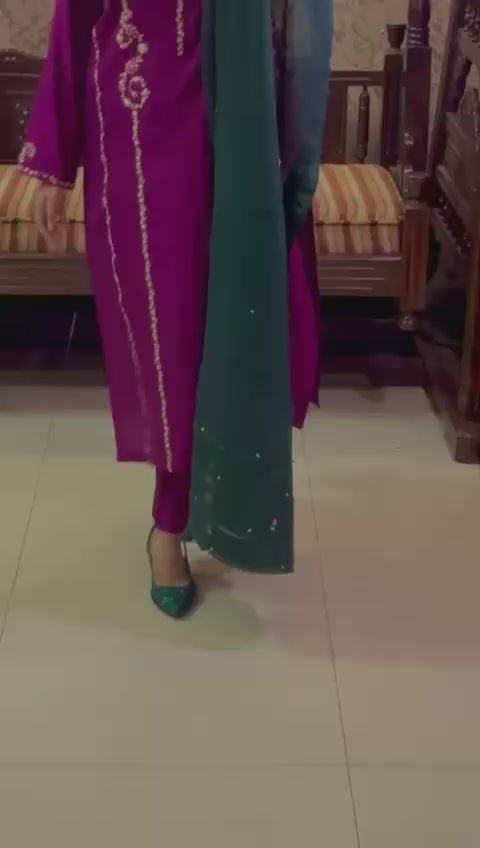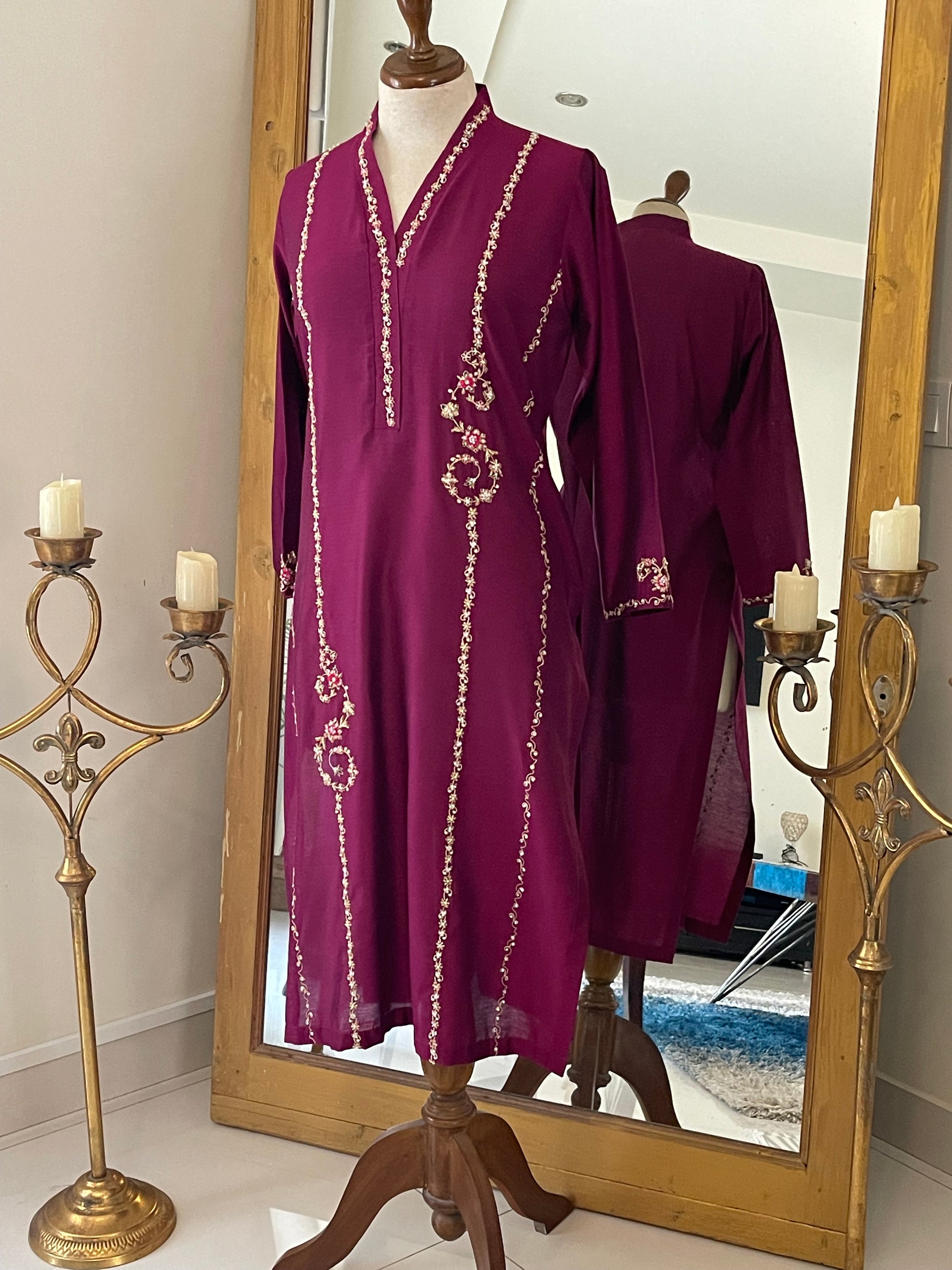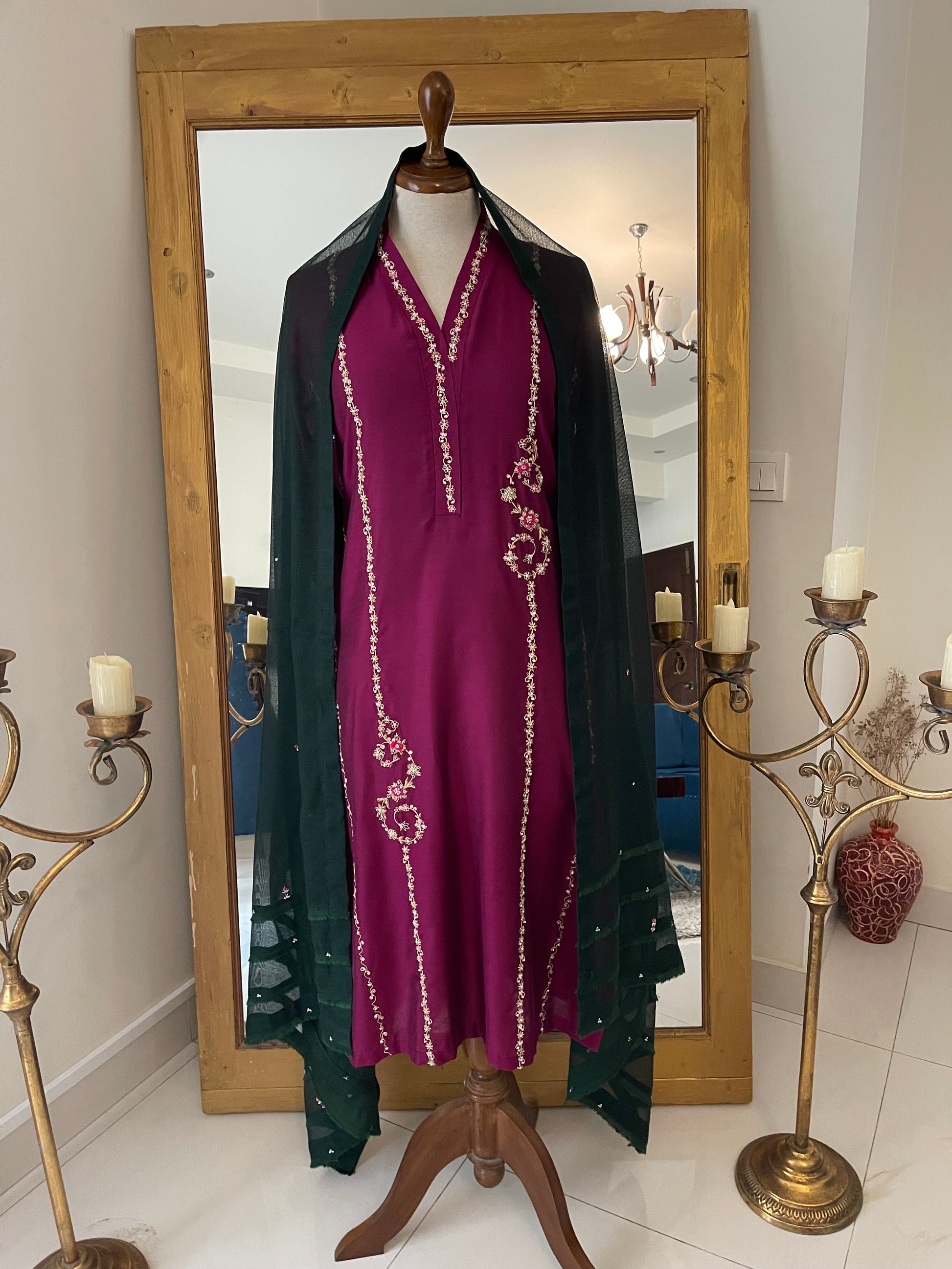 Magenta Purple cotton Katan dress with thread embroidery enhanced with hand work paired with teal green cotton net dupatta with thread out borders and motifs