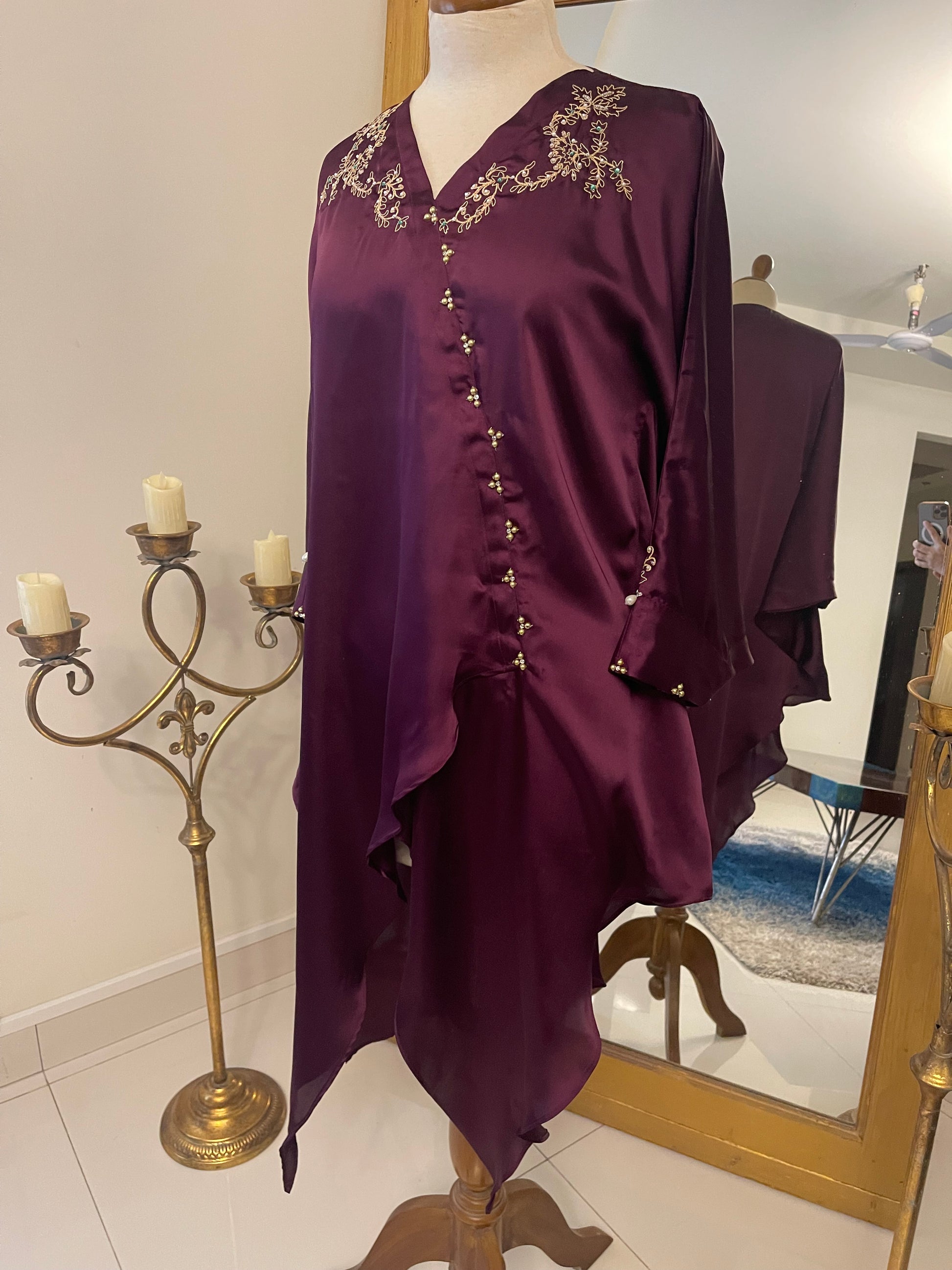 Charmeuse Silk cape top with thread emb and handwork paired with culottes