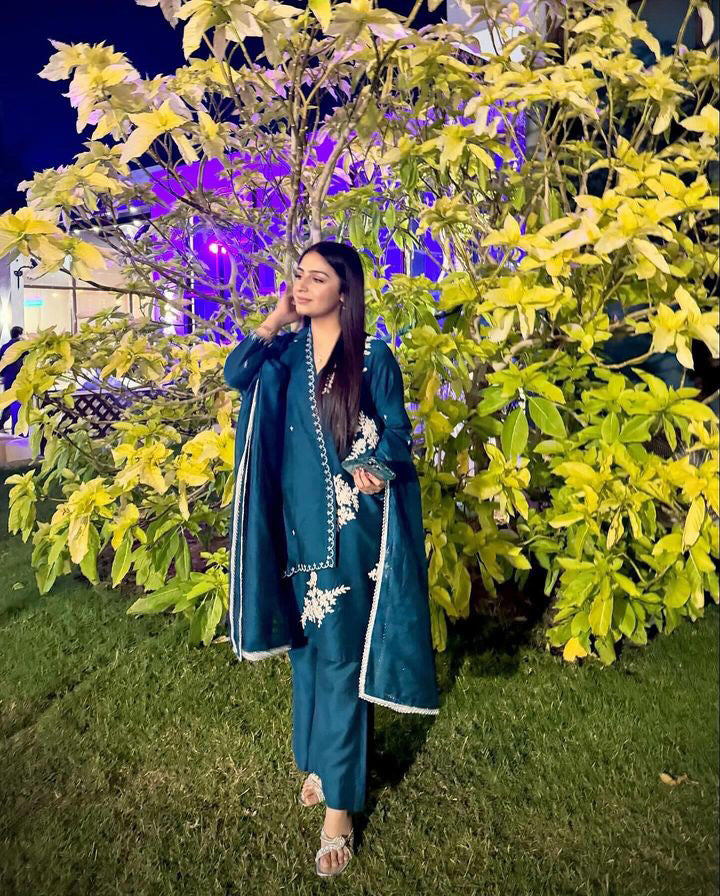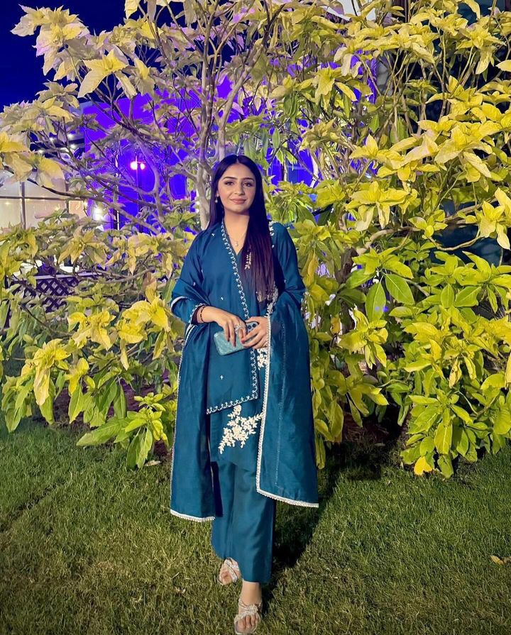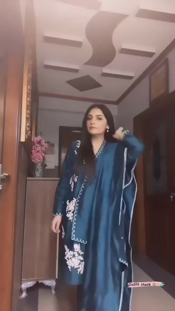 Teal blue tunic style shirt with lace motifs enhanced with little thread embroidery and handwork