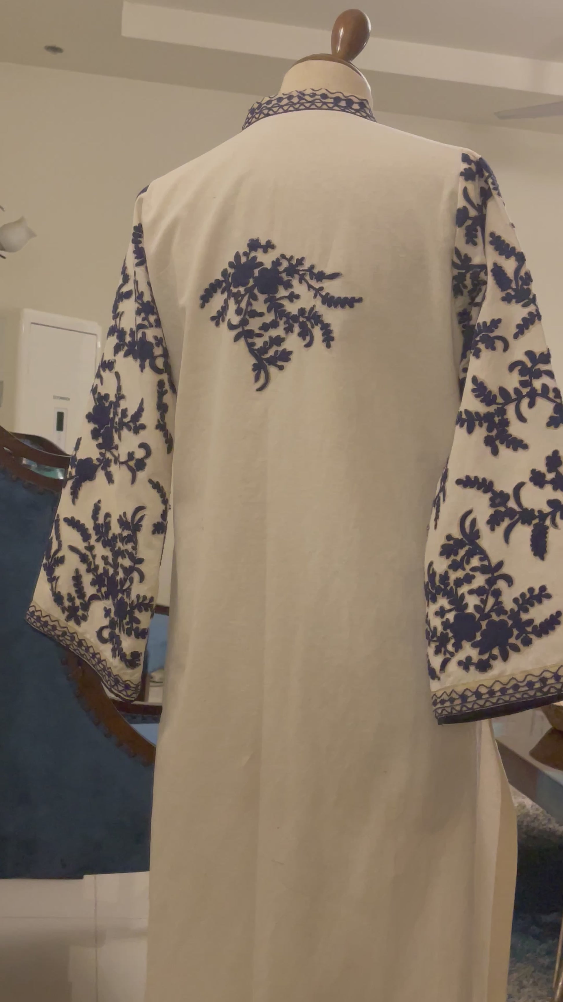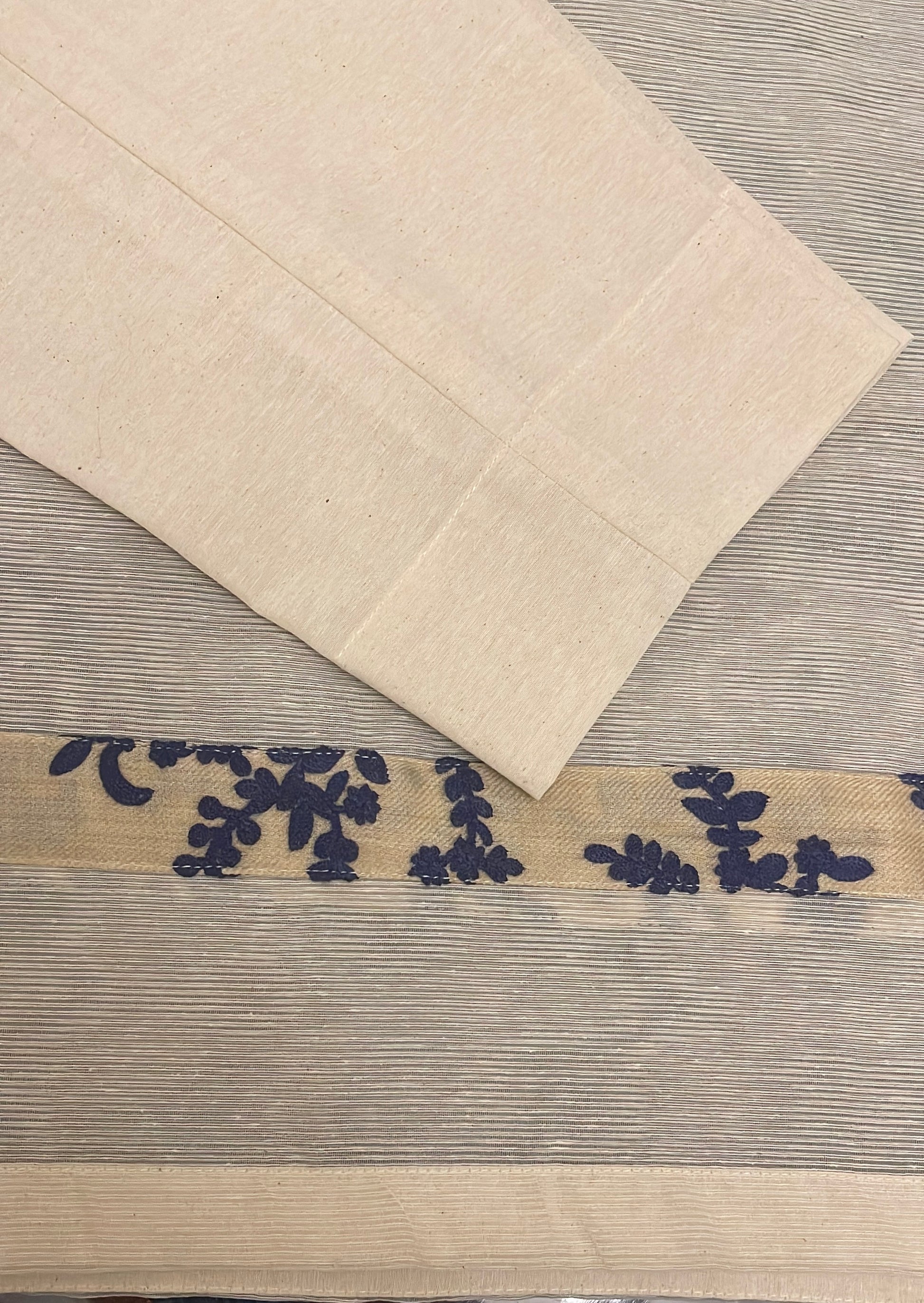 Beige self karandi with dark blue thread embroidery on sleeves daman and neck .